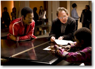 Whatever blanks remain in the characterizations are shaded in by the solid cast, which Condon has smartly, cleverly assembled with not only actors who are ideal for the roles but on whose off-screen personae the roles make a sly meta comment. Having Knowles in place as the focal, breakaway star of a successful girl group plagued with personnel shifts is loaded enough, but Condon also uses common criticisms of her previous film work to the film’s advantage. Often knocked as registering as somewhat of a blank on the big screen, Knowles on paper seems all too perfect as the meek, malleable, tabula rasa that is Deena, and indeed she nails that aspect of the part down; the childlike, walk-on-eggshells fear that she lends Deena in a dinner scene with Curtis is one of her finer screen moments. But then she and Condon have the last laugh, subverting all anyone has seen of her in this film and before with a startling climactic musical number, the original tune "Listen" (a shoo-in for a Best Original Song Oscar nod, if not the statuette itself), during which not only Deena vividly, convincingly becomes a fully-realized person, but Knowles for the first time becomes a truly dimensional actress. After being straitjacketed in too many phone-it-in formula family films in recent years, it’s almost easy to forget how dimensional an actor and downright electrifying a performer Murphy can be, as he is here as Jimmy. Playing the all-too-familiar role of a raucous, raunchy star struggling to conform to a safer image to stay popularly relevant, Murphy is liberated in every sense—not only in Jimmy’s cut-loose stage performances but also in exploring the darker edges of the character and storyline. Of the three above-the-line stars, Foxx’s villainous turn may seem too subdued and, to some observers, rather one-note, and, granted, his work here is missing a certain sense of revelation that come with his co-stars’ performances. That said, Foxx’s cocky, confident public image well informs Curtis’s snake-like personality, and he brings the necessary nuances that elevate the character beyond stock in the later stages; as the svengali finds his vise-like sense of control gradually slipping, what goes on in his eyes speaks more eloquently than mere words.