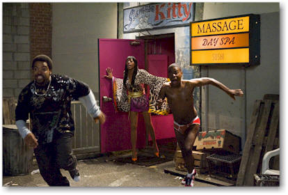 It’s bad enough that these creepy heathens wouldn’t hesitate to steal from the Lord, but what’s worse are their reasons for needing the money. Durell is so far behind in child support that his ex, Omunique (Regina Hall), is threatening to move from Baltimore to Atlanta with their young son (C.J. Sanders) unless her deadbeat baby-daddy comes up with $17,342. Meanwhile, LeeJohn is on the run from Rastafarians because of a black market business deal gone bad.